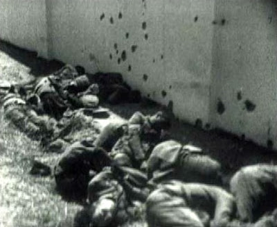 Imagen de fusilados republicanos captada por el periodista y camarógrafo francés René Brut ante las tapias del cementerio de San Juan (viejo) de Badajoz.